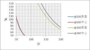 φ100では、ほとんど表面も中心部も同じように冷却されていきますが、品物が大きくなると、はっきりと表面と中心部では温度差(冷却時間差)が出ているのがわかります。